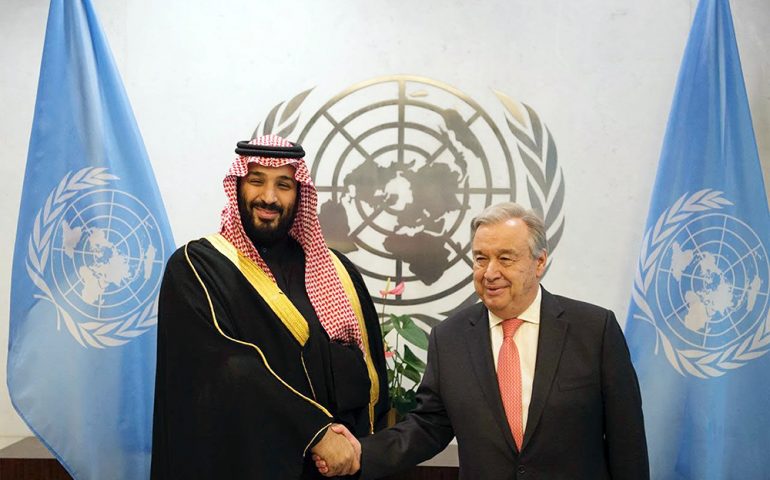 وشهد سمو ولي العهد مع الأمين العام للأمم المتحدة انطونيو غوتيرس التوقيع على البرنامج التنفيذي المشترك بين كل من المملكة العربية السعودية والأمم المتحدة لدعم وتمويل خطة الأمم المتحدة للاستجابة الإنسانية في اليمن للعام (2018)