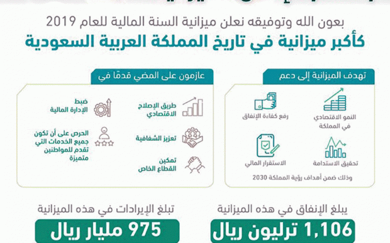 بعون الله وتوفيقه نعلن ميزانية السنة المالية للعام الهجري 1440 / 1441هـ (2019) كأكبر ميزانية في تاريخ المملكة العربية السعودية، تهدف إلى دعم النمو الاقتصادي في المملكة، ورفع كفاءة الإنفاق، وتحقيق الاستدامة والاستقرار المالي، وذلك ضمن أهداف رؤية المملكة 2030.إننا عازمون – بعون الله – على المضي قدمًا في طريق الإصلاح الاقتصادي وضبط الإدارة المالية، وتعزيز الشفافية، وتمكين القطاع الخاص، والحرص على أن تكون جميع الخدمات التي تقدم للمواطنين متميزة.