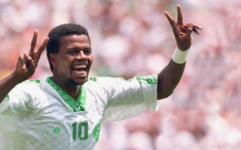 8. سعيد العويران؛ أشهر لاعبي الوسط في تاريخ كرة القدم السعودية، صاحب الهدف الأثير في كأس العالم عام 1994 في مرمى منتخب بلجيكا؛ سادس أفضل هدف في تاريخ كأس العالم، وقد لقب بعد ذلك بـ”مارادونا العرب”، وفاز بجائزة أفضل لاعب في آسيا عام 1994.